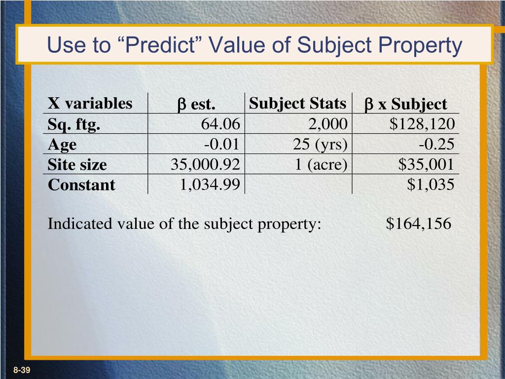 Appendix: Regression-Based Appraisal Value = B0 + B1 x1 + B2 x2 + B3 x3 +… Bn xn + e • Bs are constant coefficients representing dollar value contributed per unit of xi • Bi may be the value of having a particular attribute if xi is a 0/1 attribute variable. • xi is a feature of the structure (size, age, quality, location) • Known as an hedonic equation