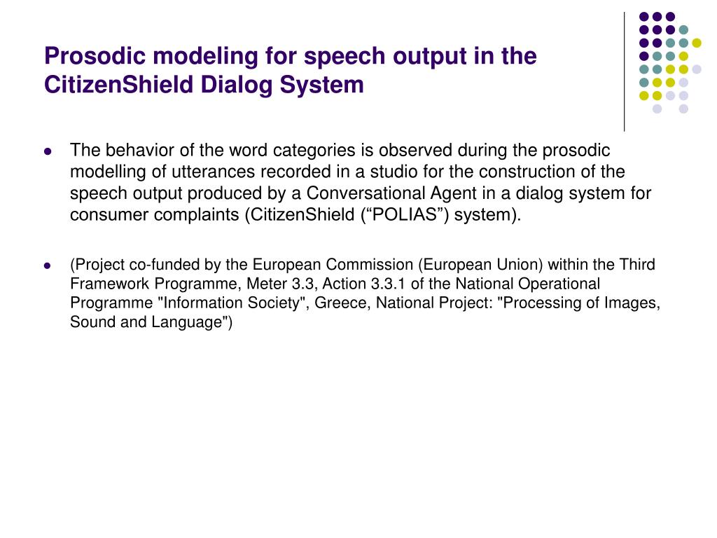Prosodic modeling for speech output in the CitizenShield Dialog System • The behavior of the word categories is observed during the prosodic modelling of utterances recorded in a studio for the construction of the speech output produced by a Conversational Agent in a dialog system for consumer complaints (CitizenShield (“POLIAS”) system). • (Project co-funded by the European Commission (European Union) within the Third Framework Programme, Meter 3.3, Action 3.3.1 of the National Operational Programme "Information Society", Greece, National Project: "Processing of Images, Sound and Language")