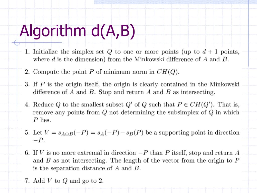 Properties • Distance • distance(A,B) = minaA,b B || a–b ||2 • distance(A,B) = min c A⊖B || c ||2 • if A and B disjoint, c is a point on boundary of Minkowski difference • Penetration Depth • pd(A,B) = min{ || t ||2 | A Translated(B,t) = } • pd(A,B) = mint A⊖B|| t ||2 • if A and B intersect, t is a point on boundary of Minkowski difference