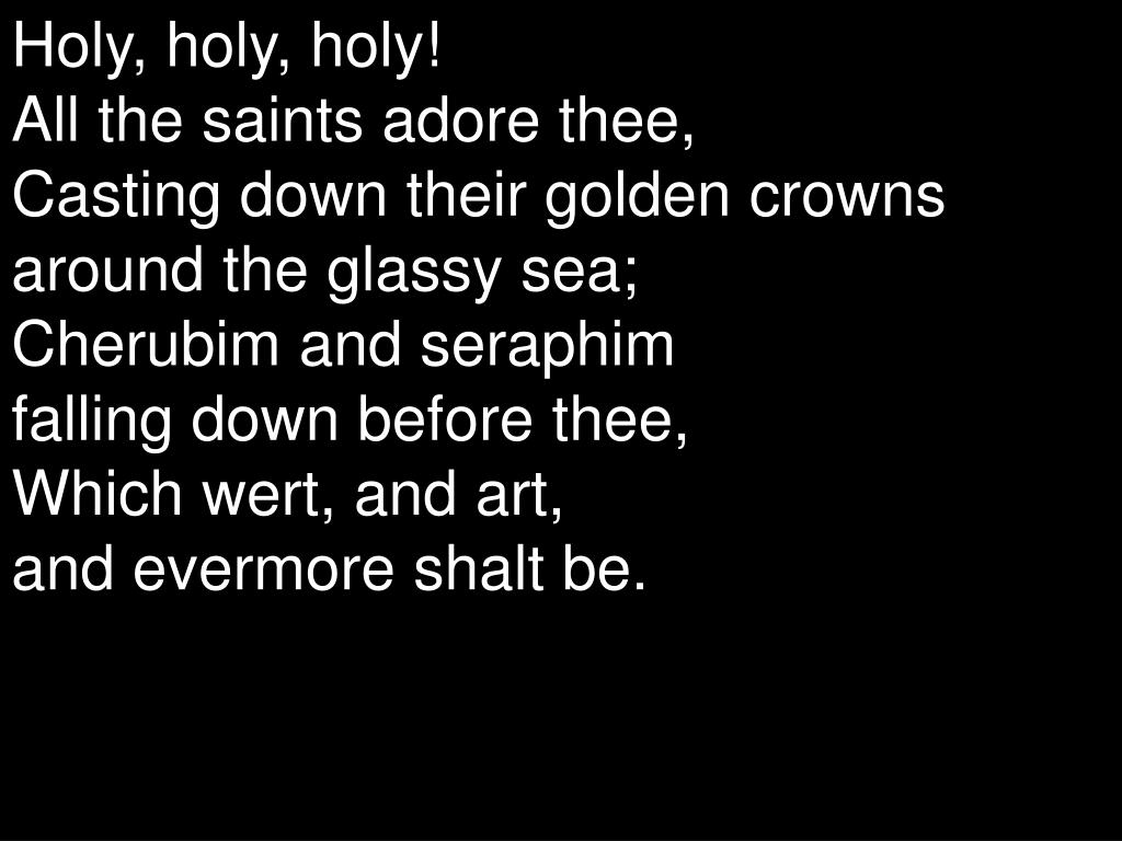 Holy, holy, holy! All the saints adore thee, Casting down their golden crowns around the glassy sea; Cherubim and seraphim falling down before thee, Which wert, and art, and evermore shalt be.