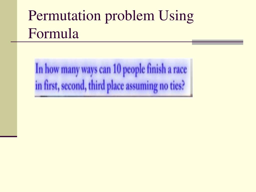 We’re only concerned with placing the top three positions. Since order matters, it is a permutation problem. 10 possible ways a person can come in first, 9 possible ways a person can come in second, 8 possible ways a person can come in third. 10*9*8=720 possible ways a person can come in first, second, and third place assuming no ties Using the formula: 10! = 10*9*8=720 • (10-3) !