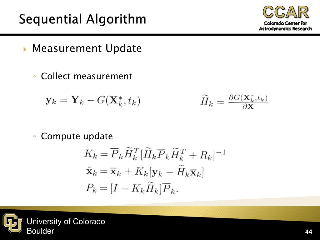 Sequential Algorithm • 1. Initialize the first run • 2. Start at the reference epoch • 3. Time Update • Integrate from the current time to the next time of interest • Map the state estimate and the covariance to the new time • 4. Measurement Update • If there is a new measurement, process it. • Update the state estimate and covariance with this new information • Repeat 3-4 until all measurements have been processed and all times of interest have been recorded. • Optional: Map the estimate and covariance back to the reference epoch and iterate the whole process.