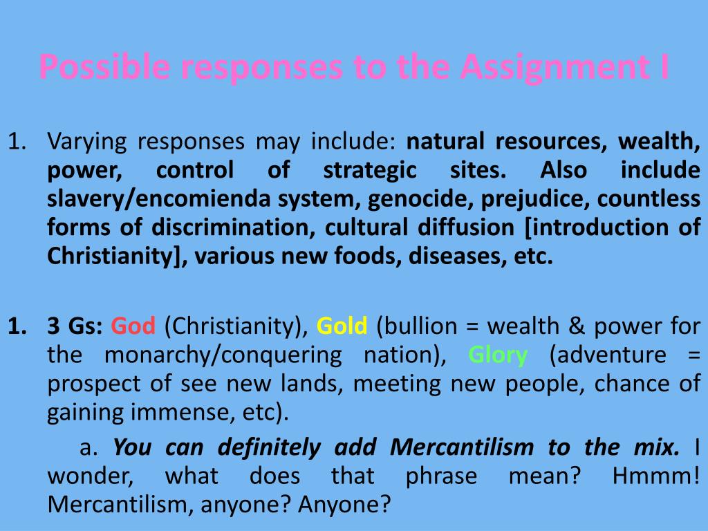 Possible responses to the Assignment I • Varying responses may include: natural resources, wealth, power, control of strategic sites. Also include slavery/encomienda system, genocide, prejudice, countless forms of discrimination, cultural diffusion [introduction of Christianity], various new foods, diseases, etc. • 3 Gs: God (Christianity), Gold (bullion = wealth & power for the monarchy/conquering nation), Glory(adventure = prospect of see new lands, meeting new people, chance of gaining immense, etc). a. You can definitely add Mercantilism to the mix. I wonder, what does that phrase mean? Hmmm! Mercantilism, anyone? Anyone?
