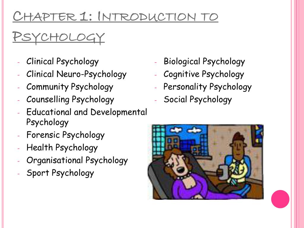 Chapter 1: Introduction to Psychology • Clinical Psychology • Clinical Neuro-Psychology • Community Psychology • Counselling Psychology • Educational and Developmental Psychology • Forensic Psychology • Health Psychology • Organisational Psychology • Sport Psychology • Biological Psychology • Cognitive Psychology • Personality Psychology • Social Psychology
