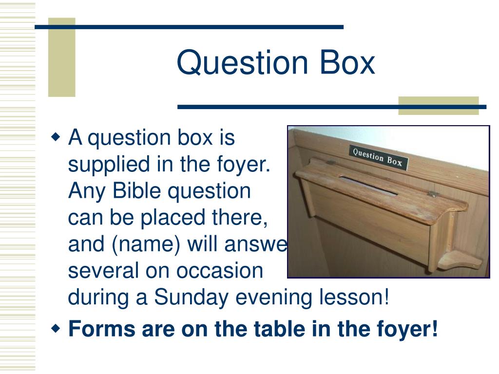 Question Box • A question box is supplied in the foyer. Any Bible question can be placed there, and (name) will answer several on occasion during a Sunday evening lesson! • Forms are on the table in the foyer!