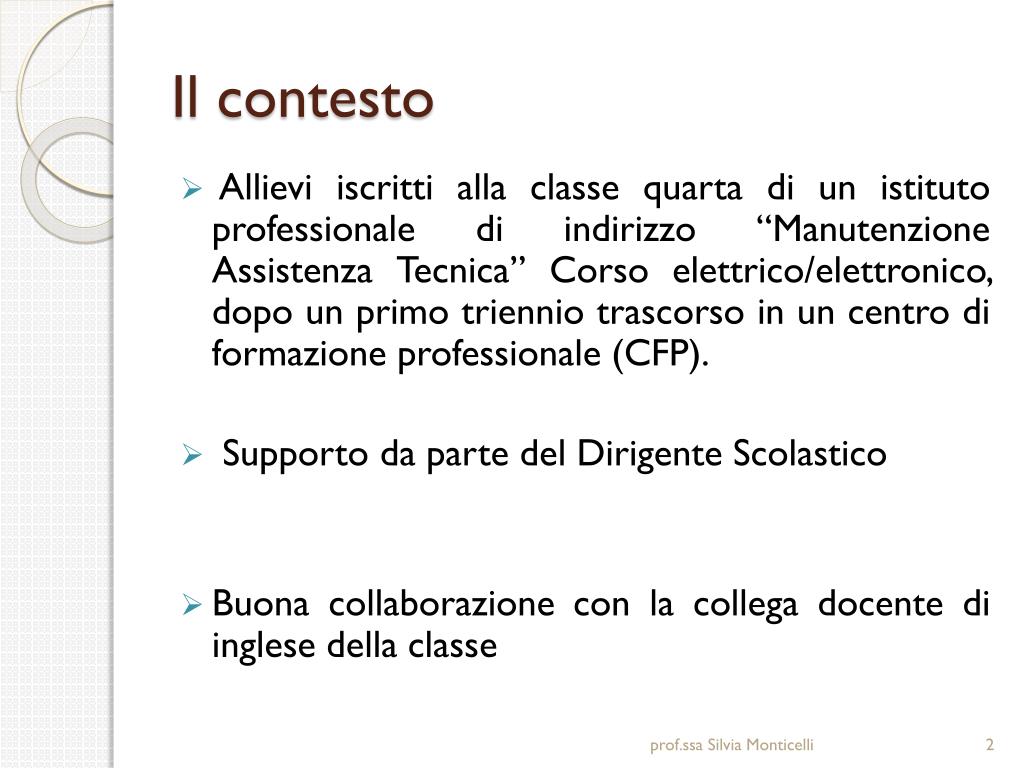 Il contesto • Allievi iscritti alla classe quarta di un istituto professionale di indirizzo “Manutenzione Assistenza Tecnica” Corso elettrico/elettronico, dopo un primo triennio trascorso in un centro di formazione professionale (CFP). • Supporto da parte del Dirigente Scolastico • Buona collaborazione con la collega docente di inglese della classe prof.ssa Silvia Monticelli