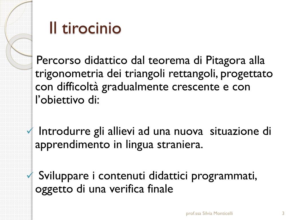 Il tirocinio Percorso didattico dal teorema di Pitagora alla trigonometria dei triangoli rettangoli, progettato con difficoltà gradualmente crescente e con l’obiettivo di: • Introdurre gli allievi ad una nuova situazione di apprendimento in lingua straniera. • Sviluppare i contenuti didattici programmati, oggetto di una verifica finale prof.ssa Silvia Monticelli