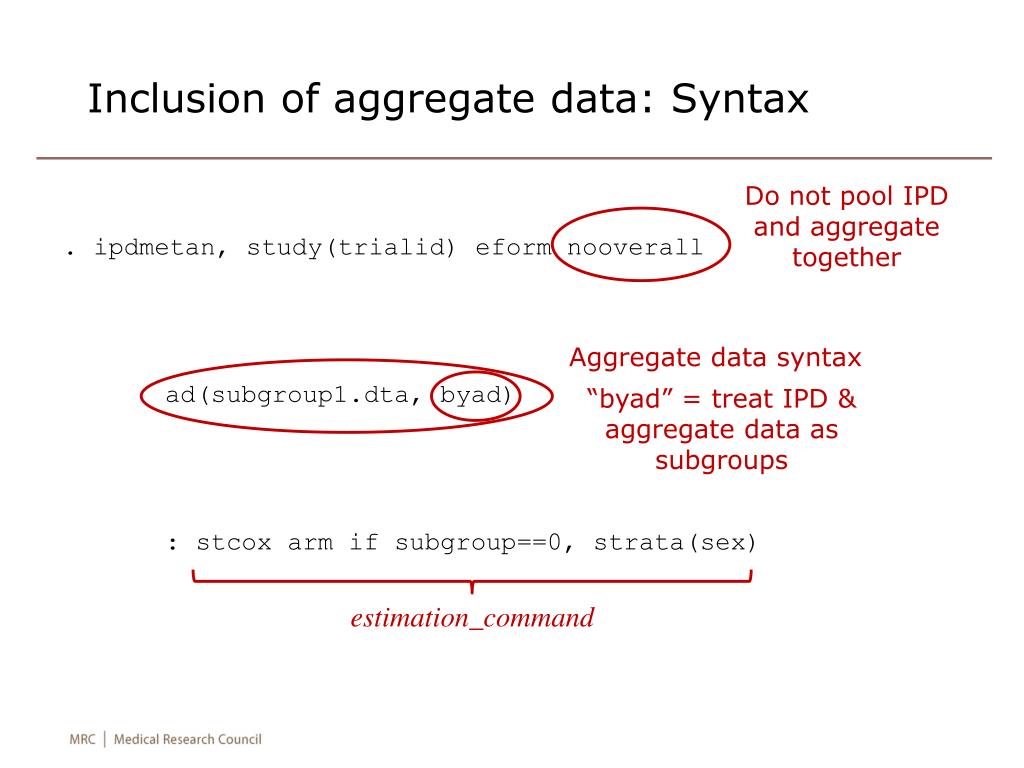Advanced syntax example:columns of data in forestplot ipdmetan(u[1,1]/V[1,1]) (1/sqrt(V[1,1])) , study(trialid) eform ad(subgroup1.dta, byad) lcols(evrate=_d %3.2f "Event rate") rcols(u[1,1] %5.2f "o-E(o)" V[1,1] %5.1f "V(o)") forest(nooverallnostatsnowt) : sts test arm if subgroup==0, mat(u V) Mean of var currently in memory (note user-assigned name, to match with varname in aggregate dataset) Collect lists of returned stats
