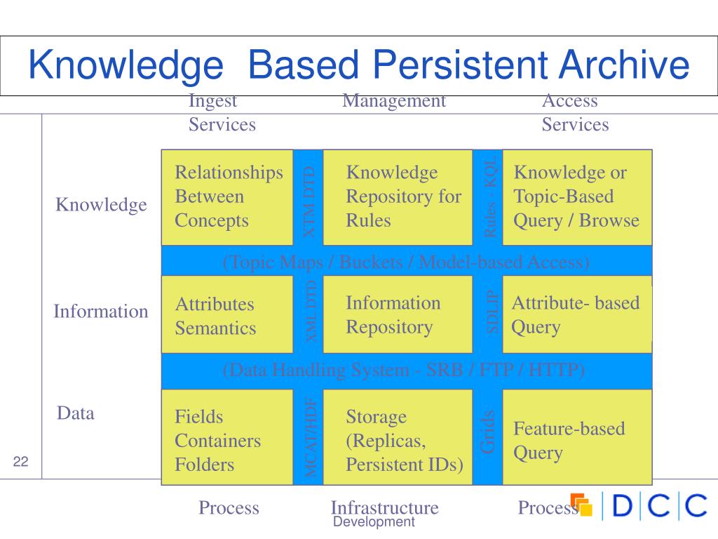 Knowledge Based Persistent Archive Process Infrastructure Process Ingest Services Management Access Services Relationships Between Concepts Knowledge Repository for Rules Knowledge or Topic-Based Query / Browse Knowledge XTM DTD • Rules - KQL (Topic Maps / Buckets / Model-based Access) Information Repository Attribute- based Query Attributes Semantics SDLIP Information XML DTD (Data Handling System - SRB / FTP / HTTP) Data Fields Containers Folders Storage (Replicas, Persistent IDs) Grids Feature-based Query MCAT/HDF Development