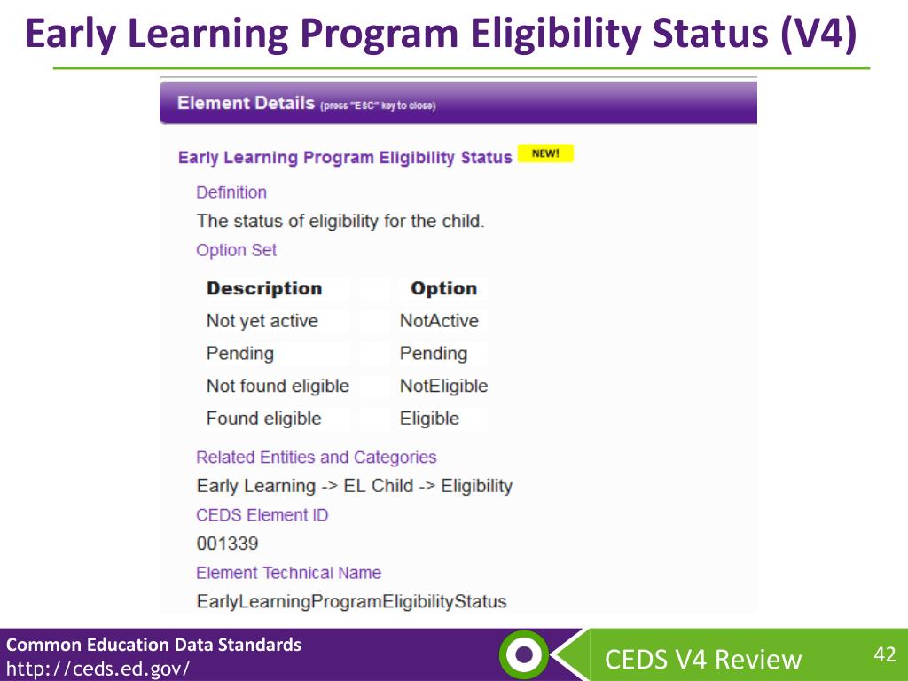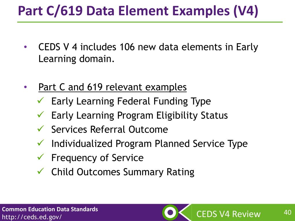 Part C/619 Data Element Examples (V4) • CEDS V 4 includes 106 new data elements in Early Learning domain. • Part C and 619 relevant examples • Early Learning Federal Funding Type • Early Learning Program Eligibility Status • Services Referral Outcome • Individualized Program Planned Service Type • Frequency of Service • Child Outcomes Summary Rating