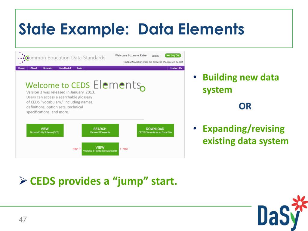 State Example: Data Elements • Building new data system OR • Expanding/revising existing data system • CEDS provides a “jump” start.