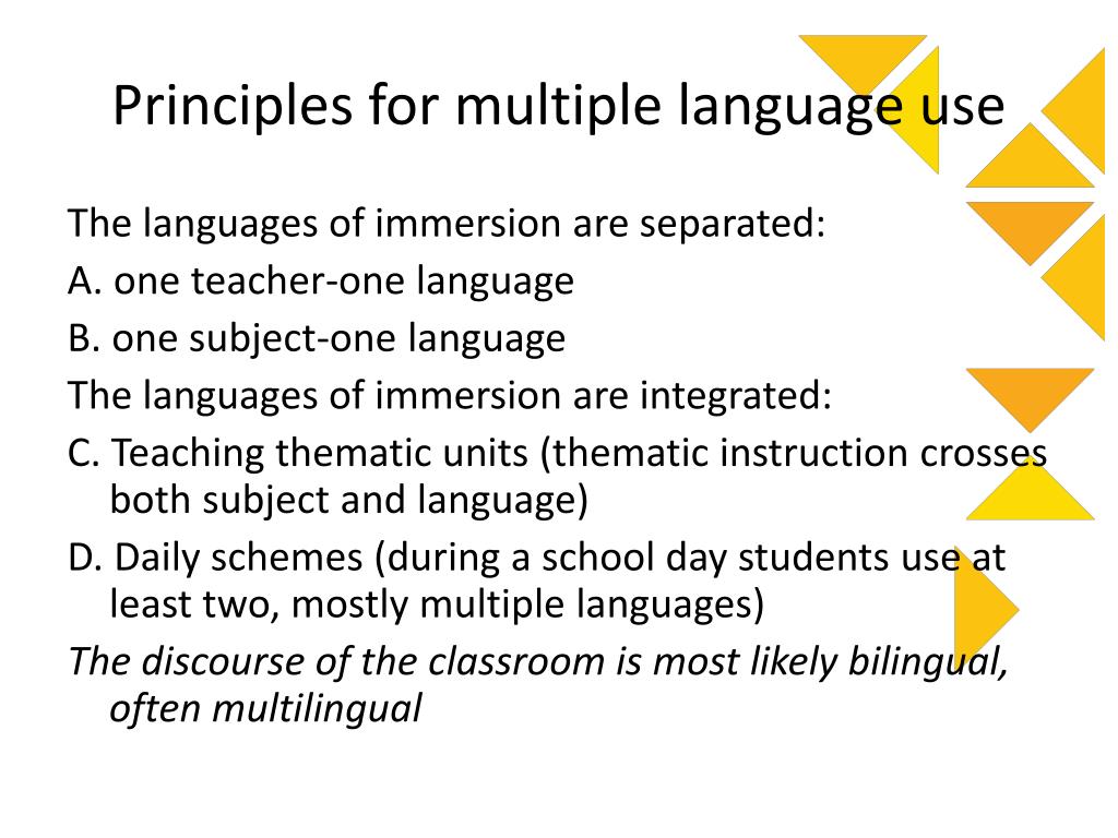Principles for multiple language use The languages of immersion are separated: A. one teacher-one language B. one subject-one language The languages of immersion are integrated: C. Teaching thematic units (thematic instruction crosses both subject and language) D. Daily schemes (during a school day students use at least two, mostly multiple languages) The discourse of the classroom is most likely bilingual, often multilingual