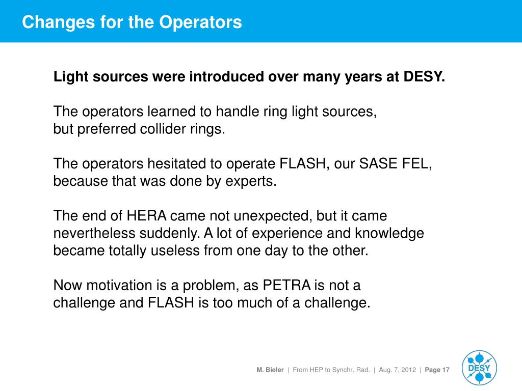 Changes for the Operators Light sources were introduced over many years at DESY. The operators learned to handle ring light sources, but preferred collider rings. The operators hesitated to operate FLASH, our SASE FEL, because that was done by experts. The end of HERA came not unexpected, but it came nevertheless suddenly. A lot of experience and knowledge became totally useless from one day to the other. Now motivation is a problem, as PETRA is not a challenge and FLASH is too much of a challenge.
