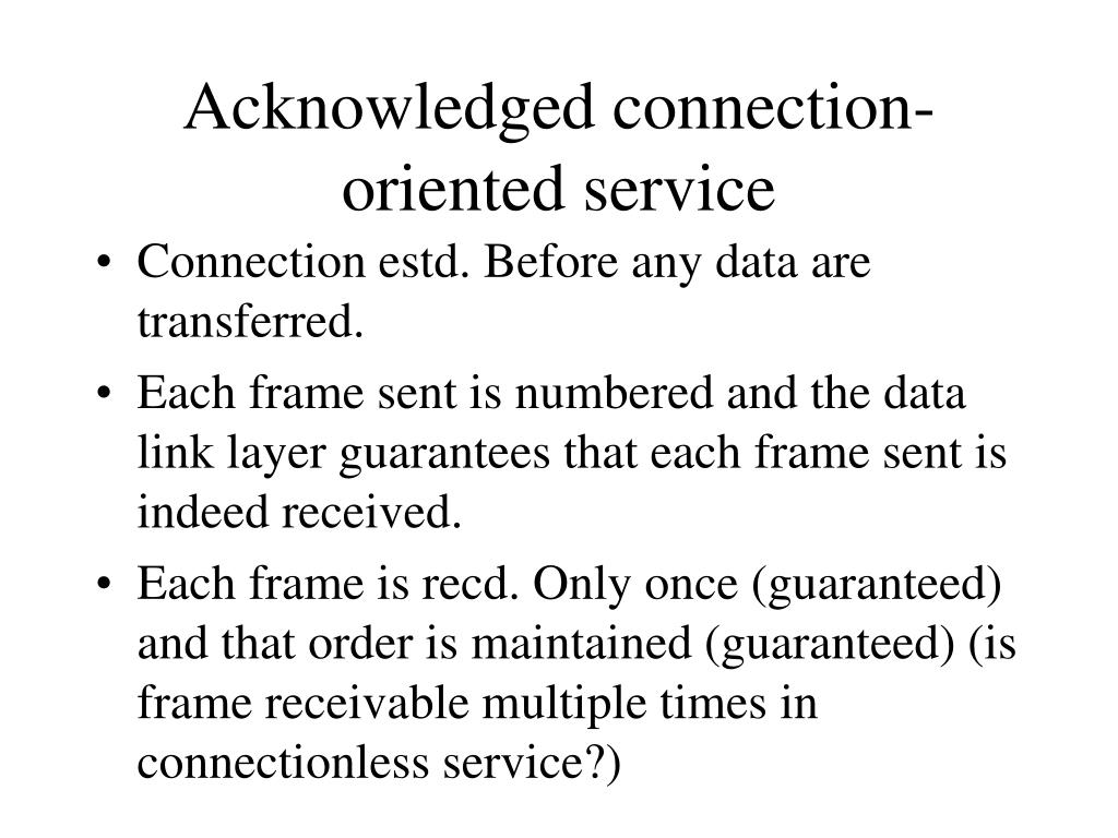 Acknowledged connection-oriented service • Connection estd. Before any data are transferred. • Each frame sent is numbered and the data link layer guarantees that each frame sent is indeed received. • Each frame is recd. Only once (guaranteed) and that order is maintained (guaranteed) (is frame receivable multiple times in connectionless service?)
