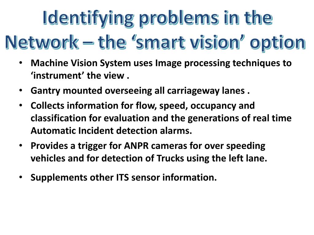 Identifying problems in the Network – the ‘smart vision’ option • Machine Vision System uses Image processing techniques to ‘instrument’ the view . • Gantry mounted overseeing all carriageway lanes . • Collects information for flow, speed, occupancy and classification for evaluation and the generations of real time Automatic Incident detection alarms. • Provides a trigger for ANPR cameras for over speeding vehicles and for detection of Trucks using the left lane. • Supplements other ITS sensor information.