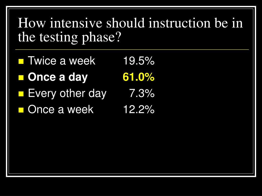 How intensive should instruction be in the testing phase? • Twice a week 19.5% • Once a day61.0% • Every other day 7.3% • Once a week 12.2%