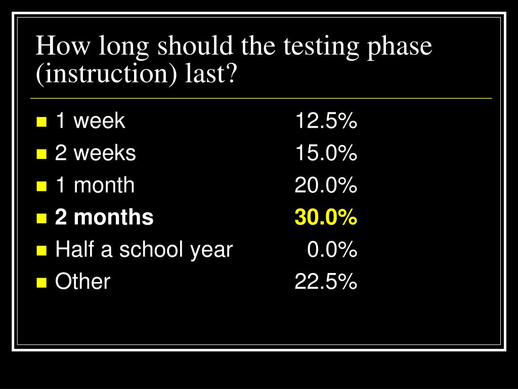 How long should the testing phase (instruction) last? • 1 week 12.5% • 2 weeks 15.0% • 1 month 20.0% • 2 months30.0% • Half a school year 0.0% • Other 22.5%