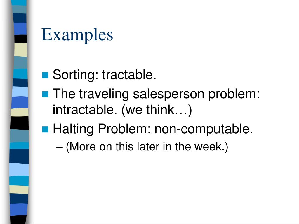 Examples • Sorting: tractable. • The traveling salesperson problem: intractable. (we think…) • Halting Problem: non-computable. • (More on this later in the week.)