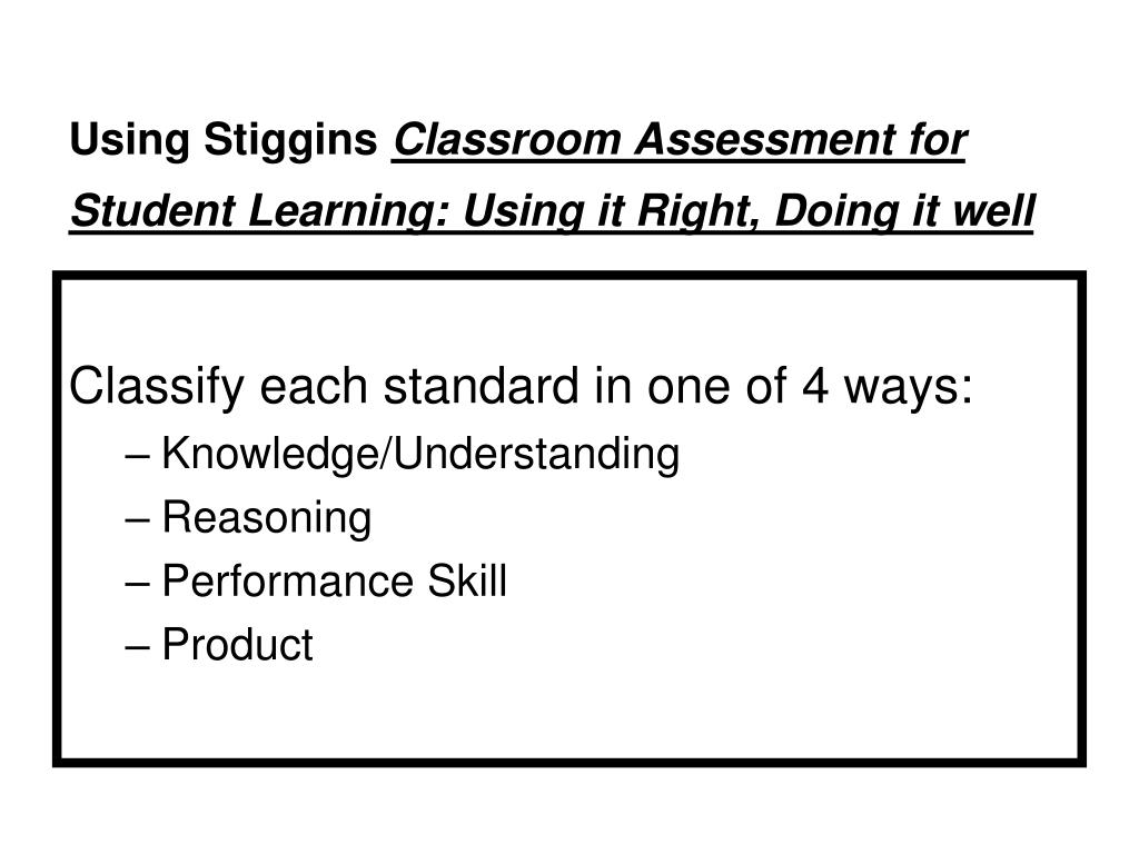 Using Stiggins Classroom Assessment for Student Learning: Using it Right, Doing it well Classify each standard in one of 4 ways: • Knowledge/Understanding • Reasoning • Performance Skill • Product