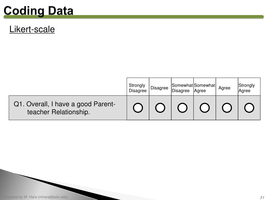 Coding Data Likert-scale Strongly Disagree Somewhat Disagree Somewhat Agree Strongly Agree Disagree Agree 1 2 3 4 5 6 Q1. Overall, I have a good Parent-teacher Relationship. NOTE: Distinguishable