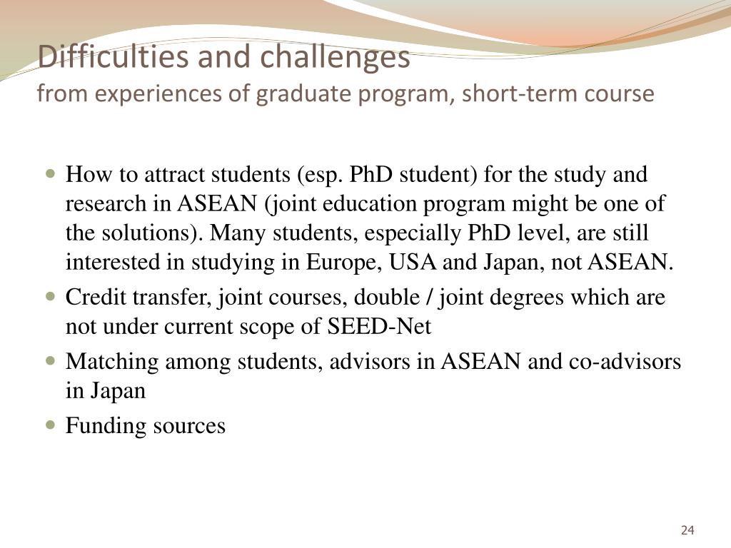 Difficulties and challengesfrom experiences of graduate program, short-term course • How to attract students (esp. PhD student) for the study and research in ASEAN (joint education program might be one of the solutions). Many students, especially PhD level, are still interested in studying in Europe, USA and Japan, not ASEAN. • Credit transfer, joint courses, double / joint degrees which are not under current scope of SEED-Net • Matching among students, advisors in ASEAN and co-advisors in Japan • Funding sources