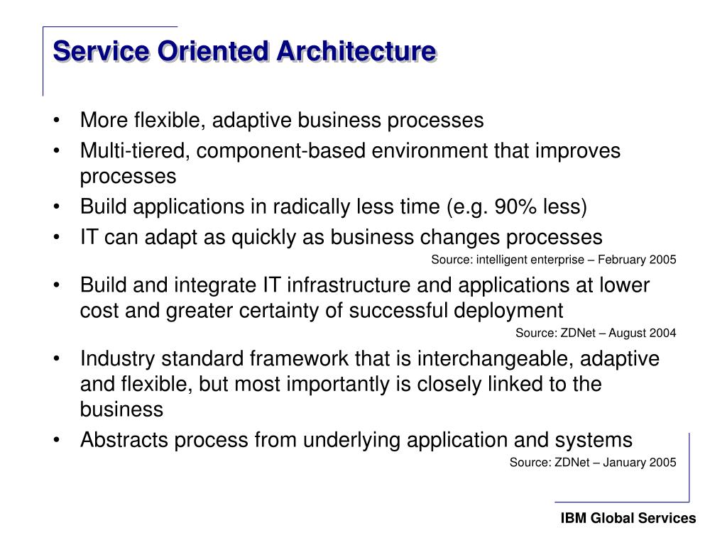 Service Oriented Architecture • More flexible, adaptive business processes • Multi-tiered, component-based environment that improves processes • Build applications in radically less time (e.g. 90% less) • IT can adapt as quickly as business changes processes • Source: intelligent enterprise – February 2005 • Build and integrate IT infrastructure and applications at lower cost and greater certainty of successful deployment • Source: ZDNet – August 2004 • Industry standard framework that is interchangeable, adaptive and flexible, but most importantly is closely linked to the business • Abstracts process from underlying application and systems • Source: ZDNet – January 2005
