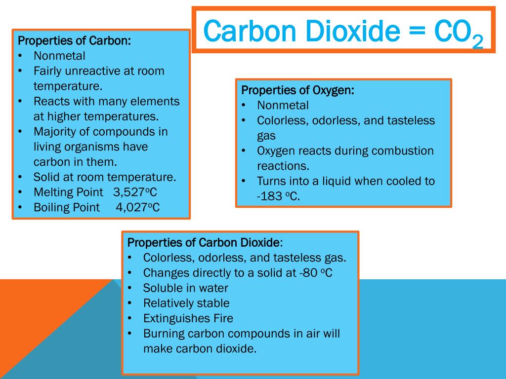 Carbon Dioxide = CO2 • Properties of Carbon: • Nonmetal • Fairly unreactive at room temperature. • Reacts with many elements at higher temperatures. • Majority of compounds in living organisms have carbon in them. • Solid at room temperature. • Melting Point 3,527oC • Boiling Point 4,027oC • Properties of Oxygen: • Nonmetal • Colorless, odorless, and tasteless gas • Oxygen reacts during combustion reactions. • Turns into a liquid when cooled to -183 oC. • Properties of Carbon Dioxide: • Colorless, odorless, and tasteless gas. • Changes directly to a solid at -80 oC • Soluble in water • Relatively stable • Extinguishes Fire • Burning carbon compounds in air will make carbon dioxide.