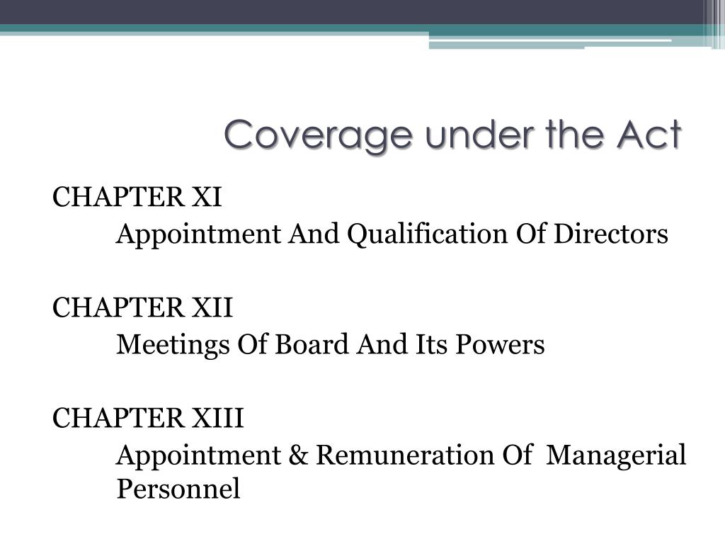 Coverage under the Act CHAPTER XI Appointment And Qualification Of Directors CHAPTER XII Meetings Of Board And Its Powers CHAPTER XIII Appointment & Remuneration Of Managerial Personnel