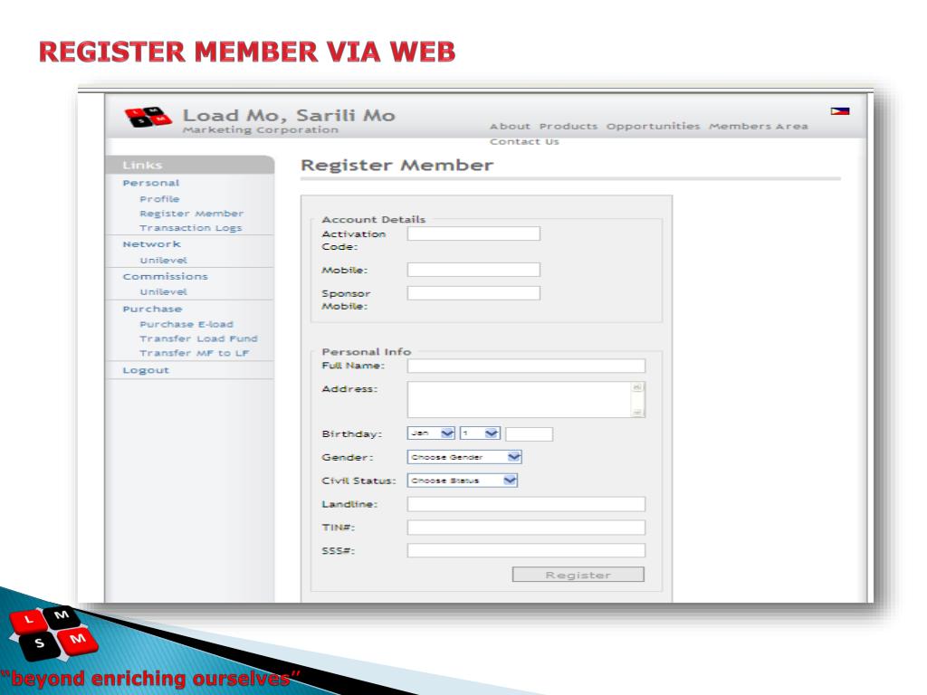 MEMBER-GETS-MEMBER CONCEPT UNILEVEL MARKETING SYSTEM Self loading Self loading Self loading Self loading Self loading Self loading A MEMBER WHO ENJOYS THE CONVENIENCE OF SELF-LOADING WILL DEFINITELY SHARE IT TO OTHERS – LAW OF DUPLICATION Member EARNS REBATES on his/her load and the load of his/her members Member EARNS REWARDS POINTS for all Referrals in his / her group “beyond enriching ourselves”
