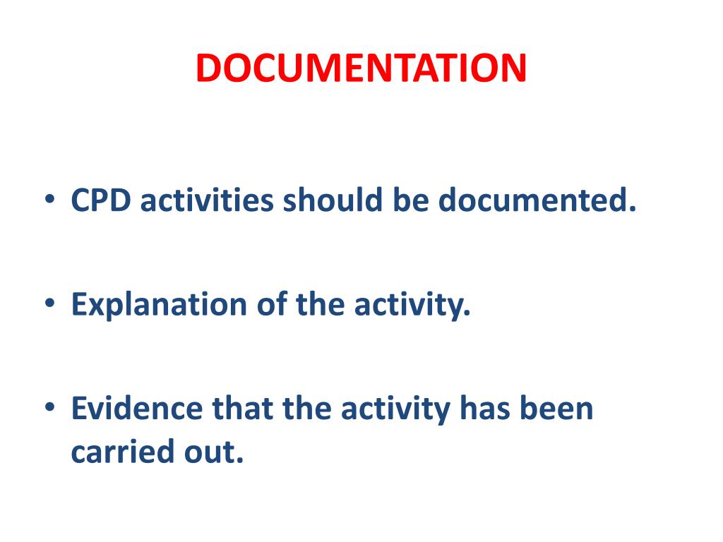 DOCUMENTATION • CPD activities should be documented. • Explanation of the activity. • Evidence that the activity has been carried out.