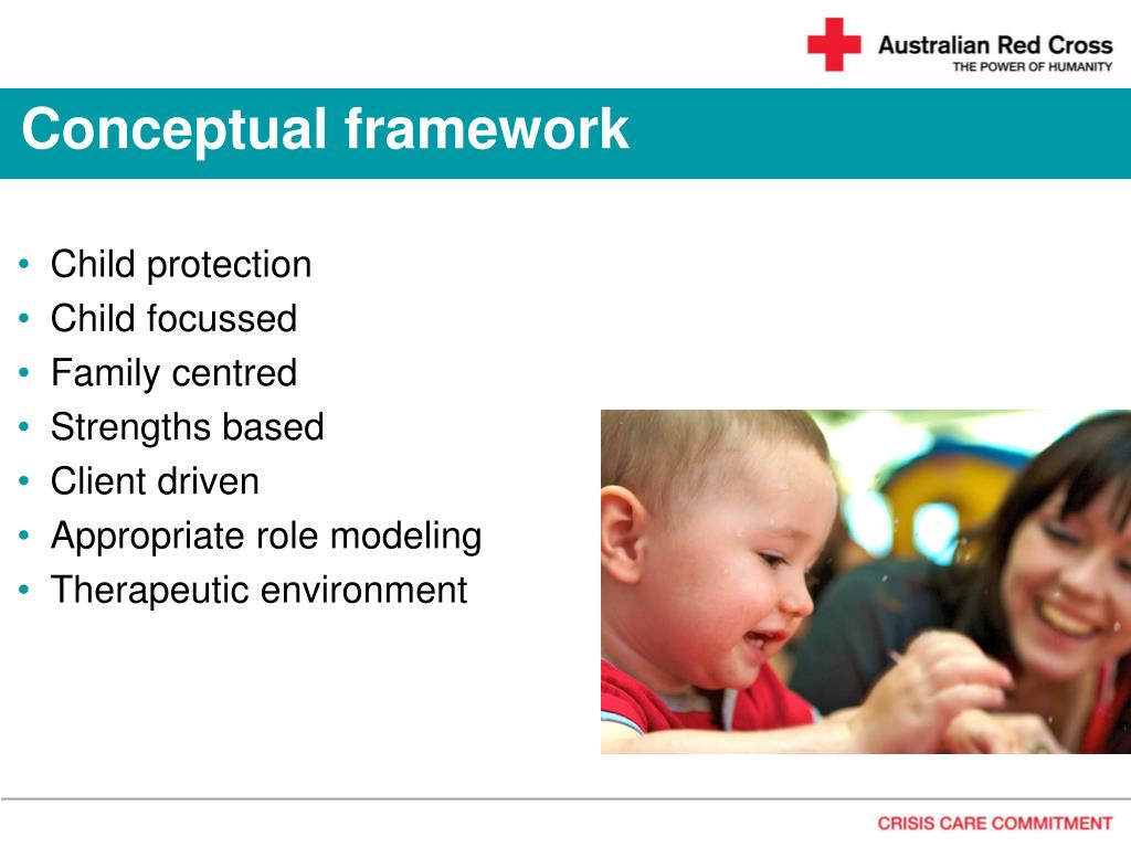 Conceptual framework • Child protection • Child focussed • Family centred • Strengths based • Client driven • Appropriate role modeling • Therapeutic environment