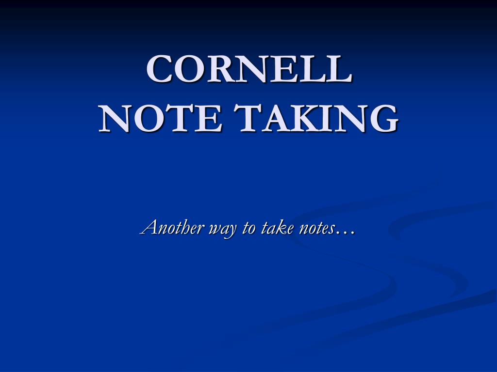 CORNELL NOTE TAKING. Another way to take notes…. What Research Says…. Verbatim note taking is the least effective way to take notes. Notes should be considered a work in progress Notes should be used as study guides for tests The MORE notes that are taken, the better!. What Marzano Says….