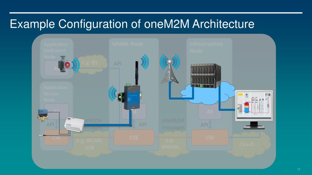 Example Configuration of oneM2M Architecture Application Dedicated Node Middle Node Infrastructure Node e.g. BT API AE Application Service Node AE AE AE AE oneM2Mmessages oneM2Mmessages API API API API CSE CSE CSE e.g. WLAN, USB e.g.WWAN Cloud