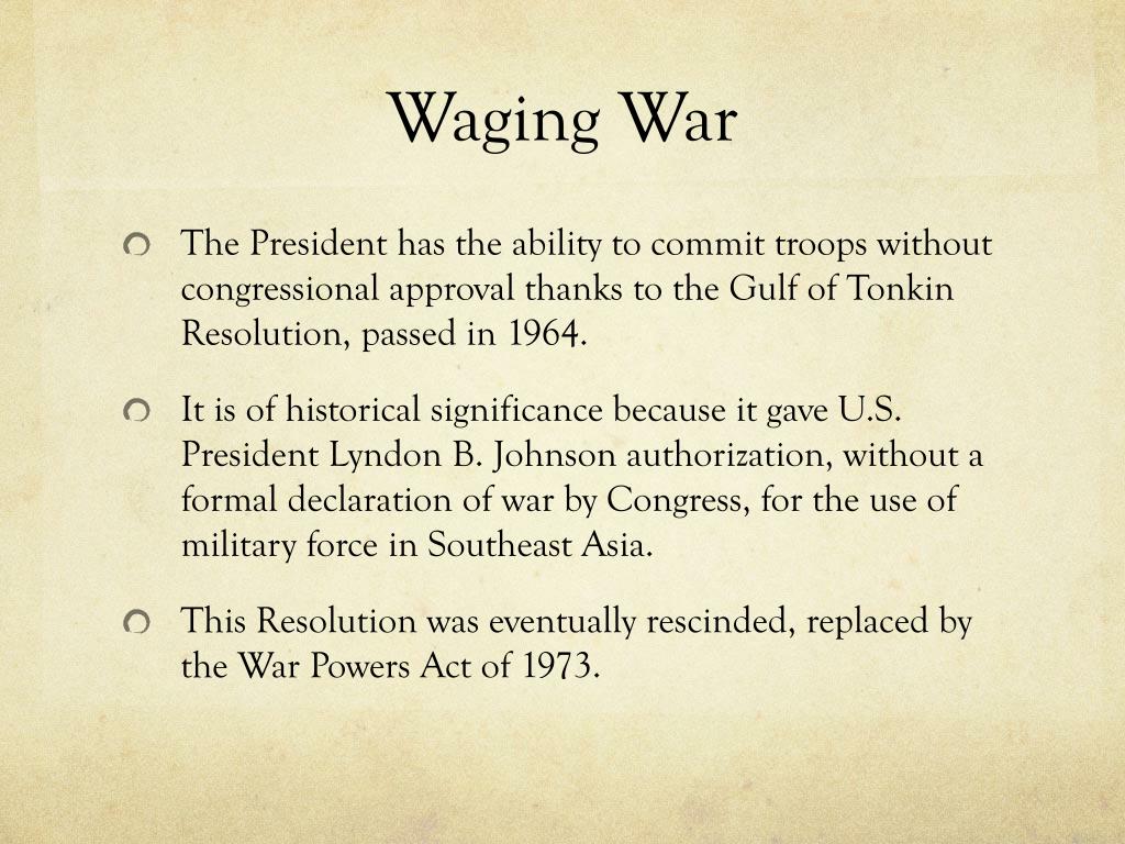 Waging War • The President has the ability to commit troops without congressional approval thanks to the Gulf of Tonkin Resolution, passed in 1964. • It is of historical significance because it gave U.S. President Lyndon B. Johnson authorization, without a formal declaration of war by Congress, for the use of military force in Southeast Asia. • This Resolution was eventually rescinded, replaced by the War Powers Act of 1973.
