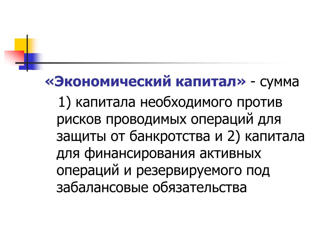«Экономический капитал»- сумма 1) капитала необходимого против рисков проводимых операций для защиты от банкротства и 2) капитала для финансирования активных операций и резервируемого под забалансовые обязательства