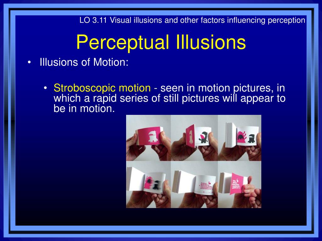 LO 3.11 Visual illusions and other factors influencing perception Perceptual Illusions • Illusions of Motion: • Stroboscopic motion - seen in motion pictures, in which a rapid series of still pictures will appear to be in motion.