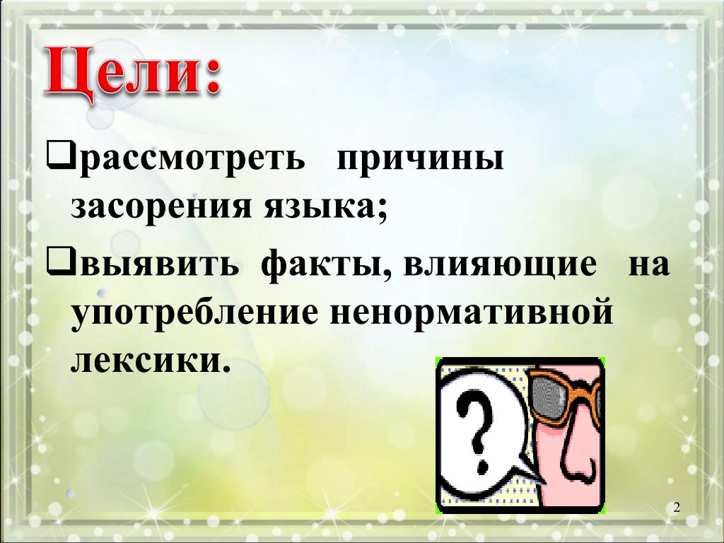 Цели: • рассмотреть причины засорения языка; • выявить факты, влияющие на употребление ненормативной лексики.