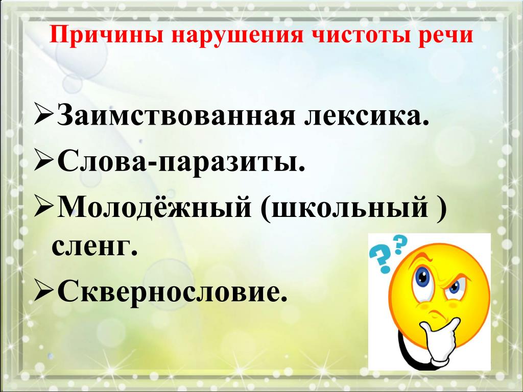 Причины нарушения чистоты речи • Заимствованная лексика. • Слова-паразиты. • Молодёжный (школьный ) сленг. • Сквернословие.