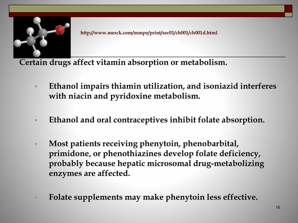http://www.merck.com/mmpe/print/sec01/ch001/ch001d.html Certain drugs affect vitamin absorption or metabolism. • Ethanol impairs thiamin utilization, and isoniazid interferes with niacin and pyridoxine metabolism. • Ethanol and oral contraceptives inhibit folate absorption. • Most patients receiving phenytoin, phenobarbital, primidone, or phenothiazines develop folate deficiency, probably because hepatic microsomal drug-metabolizing enzymes are affected. • Folate supplements may make phenytoin less effective.