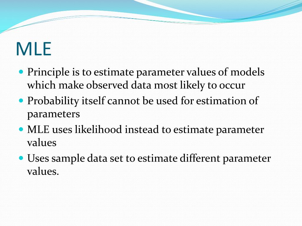 MLE • Principle is to estimate parameter values of models which make observed data most likely to occur • Probability itself cannot be used for estimation of parameters • MLE uses likelihood instead to estimate parameter values • Uses sample data set to estimate different parameter values.