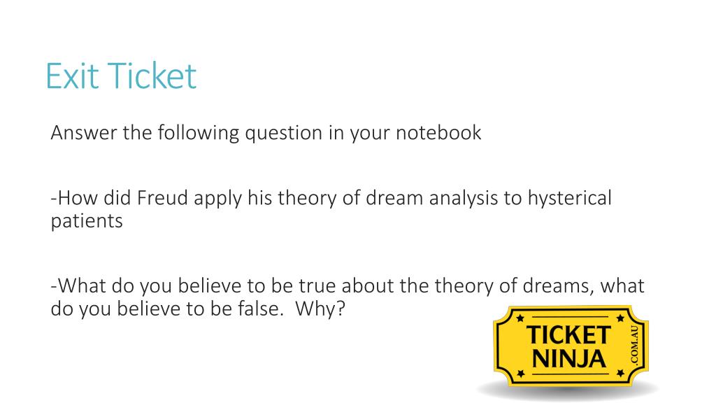Exit Ticket • Answer the following question in your notebook • -How did Freud apply his theory of dream analysis to hysterical patients • -What do you believe to be true about the theory of dreams, what do you believe to be false. Why?