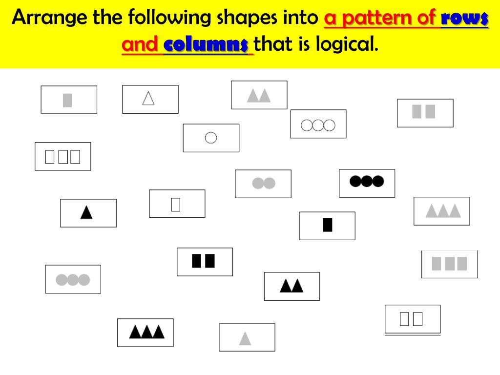 2.2 The Periodic table and Chemical Properties. Arrange the following shapes into a pattern of rows and columns that is logical . Dmitri Mendeleev + VIDEO. Just like you , he searched for patterns among elements