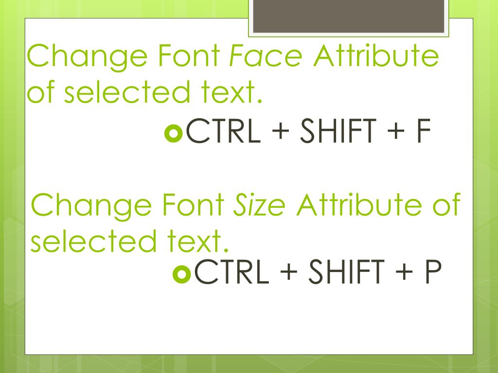 Change Font Face Attribute of selected text. • CTRL + SHIFT + F Change Font Size Attribute of selected text. • CTRL + SHIFT + P