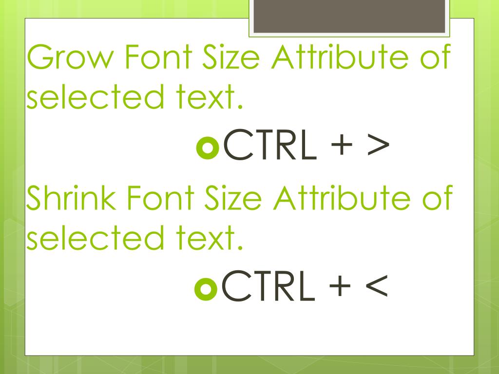 Grow Font Size Attribute of selected text. • CTRL + > Shrink Font Size Attribute of selected text. • CTRL + <