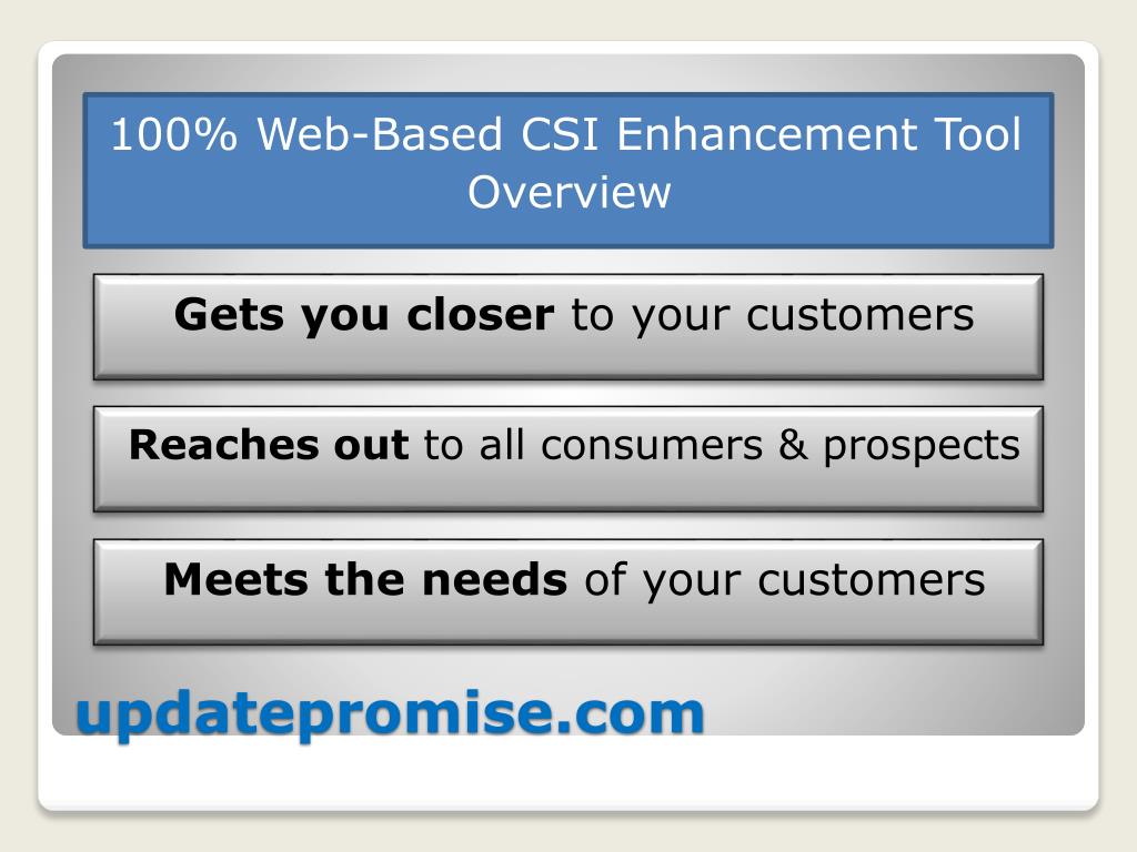 100% Web-Based CSI Enhancement Tool Overview Gets you closer to your customers • Reaches out to all consumers & prospects • Meets the needs of your customers updatepromise.com