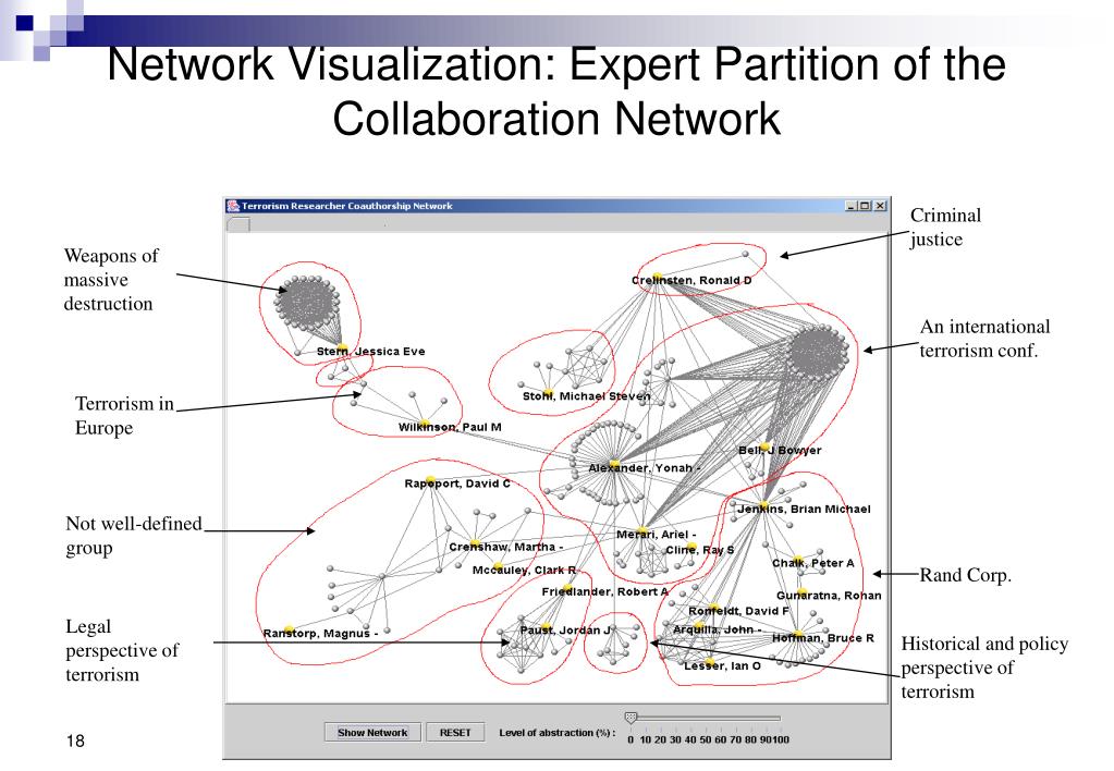 Network Visualization: Expert Partition of the Collaboration Network Criminal justice Weapons of massive destruction An international terrorism conf. Terrorism in Europe Not well-defined group Rand Corp. Legal perspective of terrorism Historical and policy perspective of terrorism