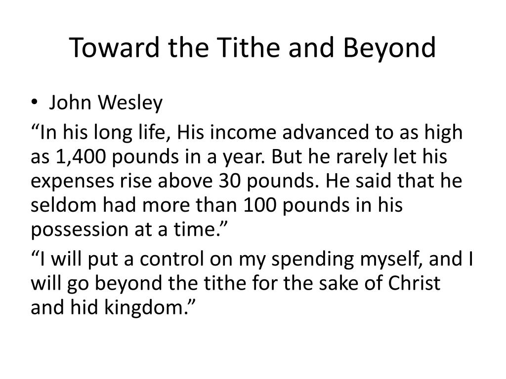 Toward the Tithe and Beyond • John Wesley “In his long life, His income advanced to as high as 1,400 pounds in a year. But he rarely let his expenses rise above 30 pounds. He said that he seldom had more than 100 pounds in his possession at a time.” “I will put a control on my spending myself, and I will go beyond the tithe for the sake of Christ and hid kingdom.”