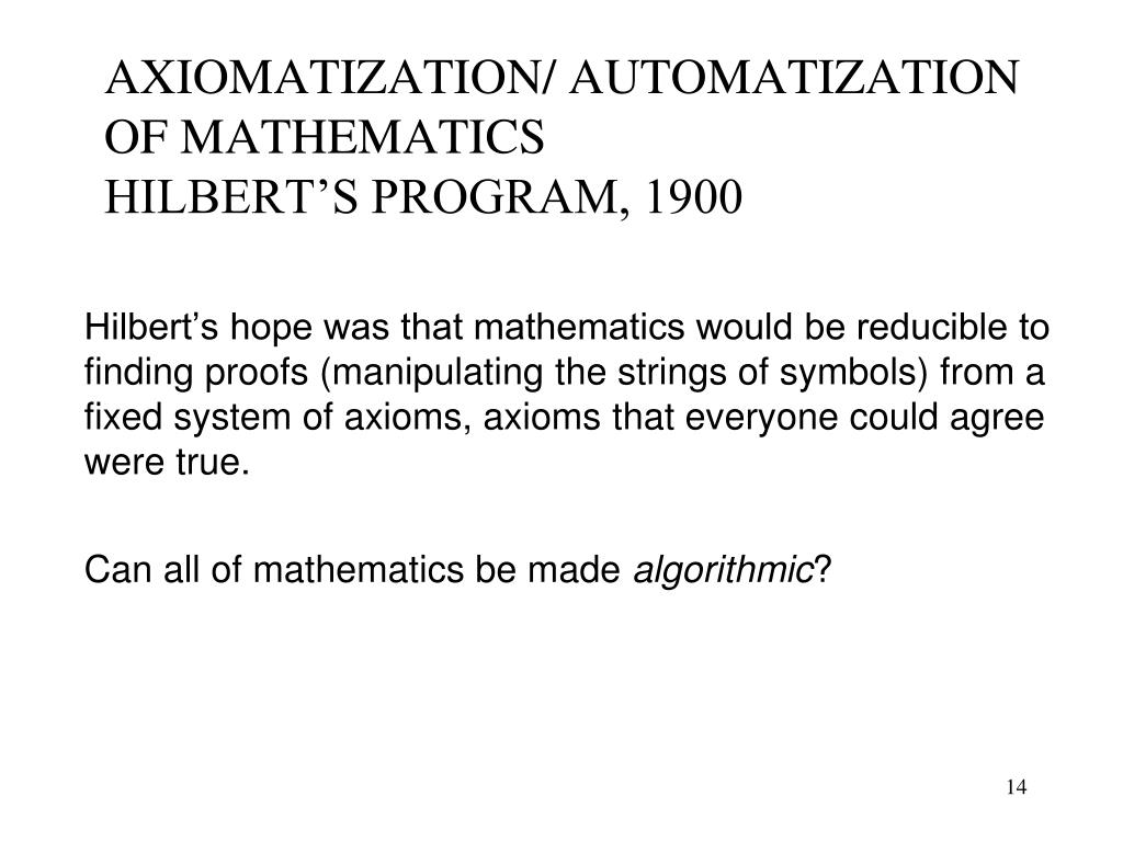 AXIOMATIZATION/ AUTOMATIZATION OF MATHEMATICS HILBERT’S PROGRAM, 1900 Hilbert’s hope was that mathematics would be reducible to finding proofs (manipulating the strings of symbols) from a fixed system of axioms, axioms that everyone could agree were true. Can all of mathematics be made algorithmic?