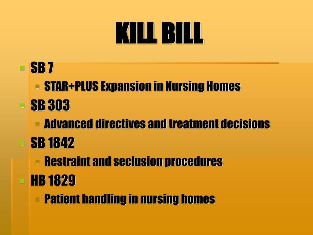KILL BILL • SB 7 • STAR+PLUS Expansion in Nursing Homes • SB 303 • Advanced directives and treatment decisions • SB 1842 • Restraint and seclusion procedures • HB 1829 • Patient handling in nursing homes