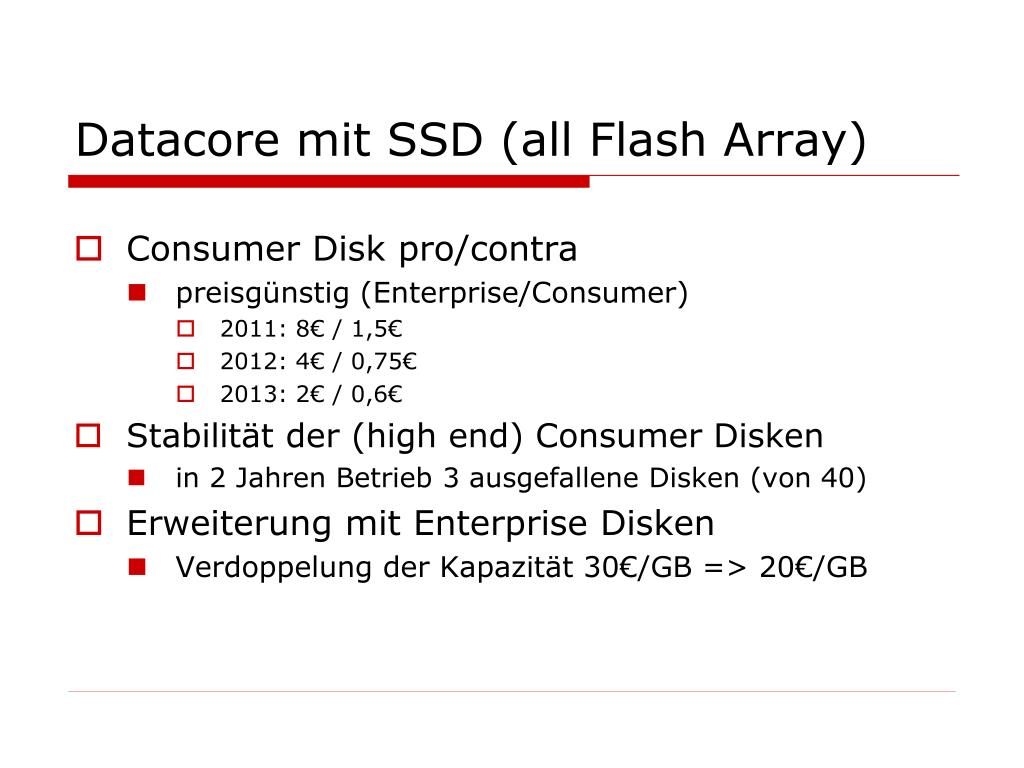 Datacore mit SSD (all Flash Array) • Consumer Disk pro/contra • preisgünstig (Enterprise/Consumer) • 2011: 8€ / 1,5€ • 2012: 4€ / 0,75€ • 2013: 2€ / 0,6€ • Stabilität der (high end) Consumer Disken • in 2 Jahren Betrieb 3 ausgefallene Disken (von 40) • Erweiterung mit Enterprise Disken • Verdoppelung der Kapazität 30€/GB => 20€/GB